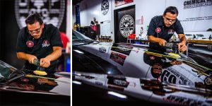 - Cera de Limpeza de Acabamento Slick com um polidor de dupla acção utilizando uma almofada de espuma de acabamento limpo.